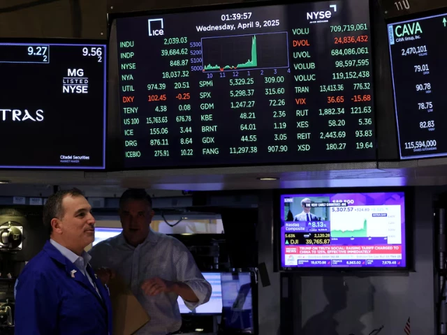 Traders work on the floor at the New York Stock Exchange (NYSE) in New York City after the White House announced a 90-day pause & lowered 10% reciprocal tariff for other countries, U.S., April 9, 2025. REUTERS/Brendan McDermid