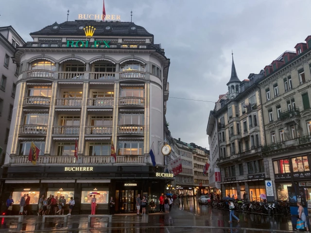 A logo of watchmaker Rolex adorns a building on Grendel Street during a rainy day at Schwanenplatz in Lucerne, Switzerland (via: Reuters)
